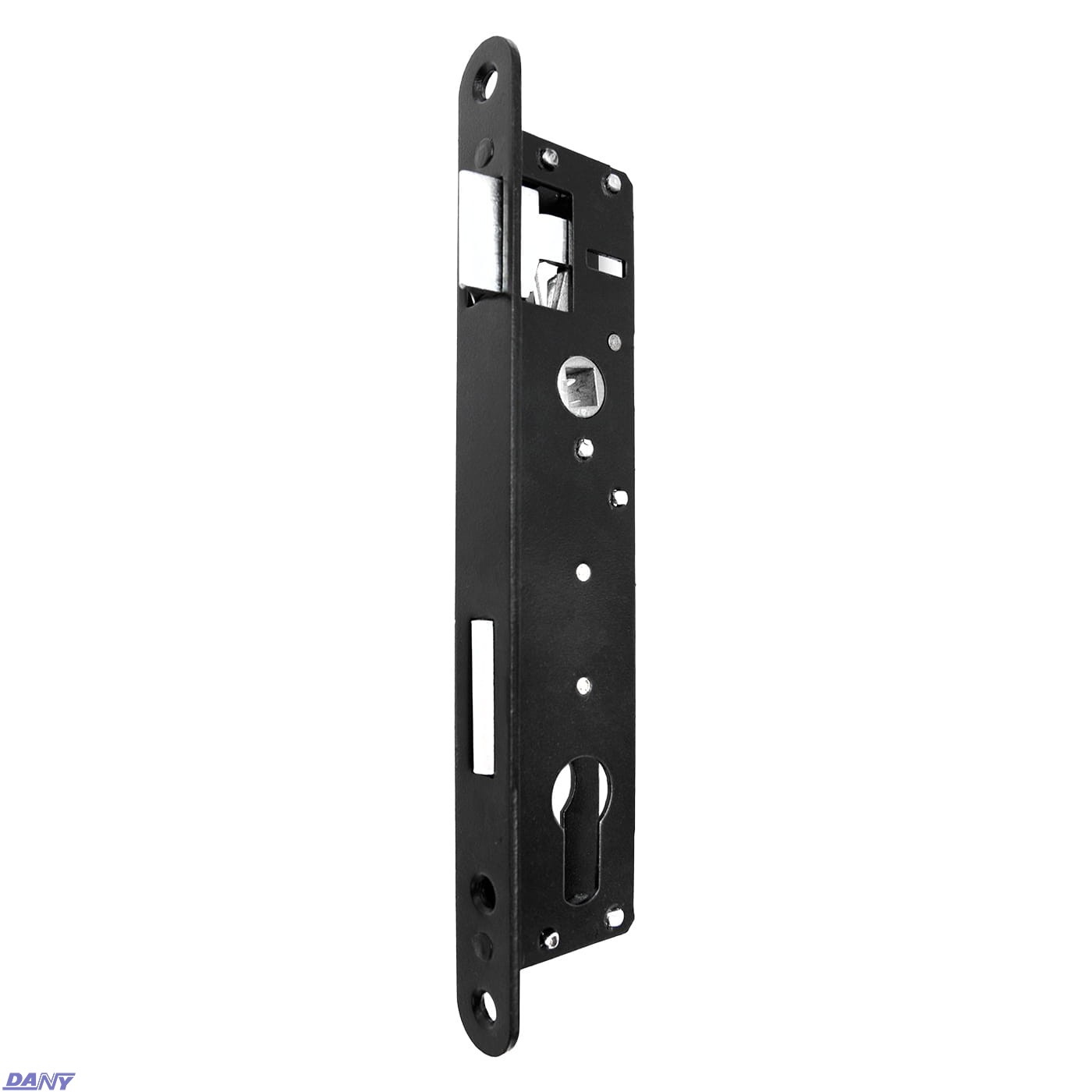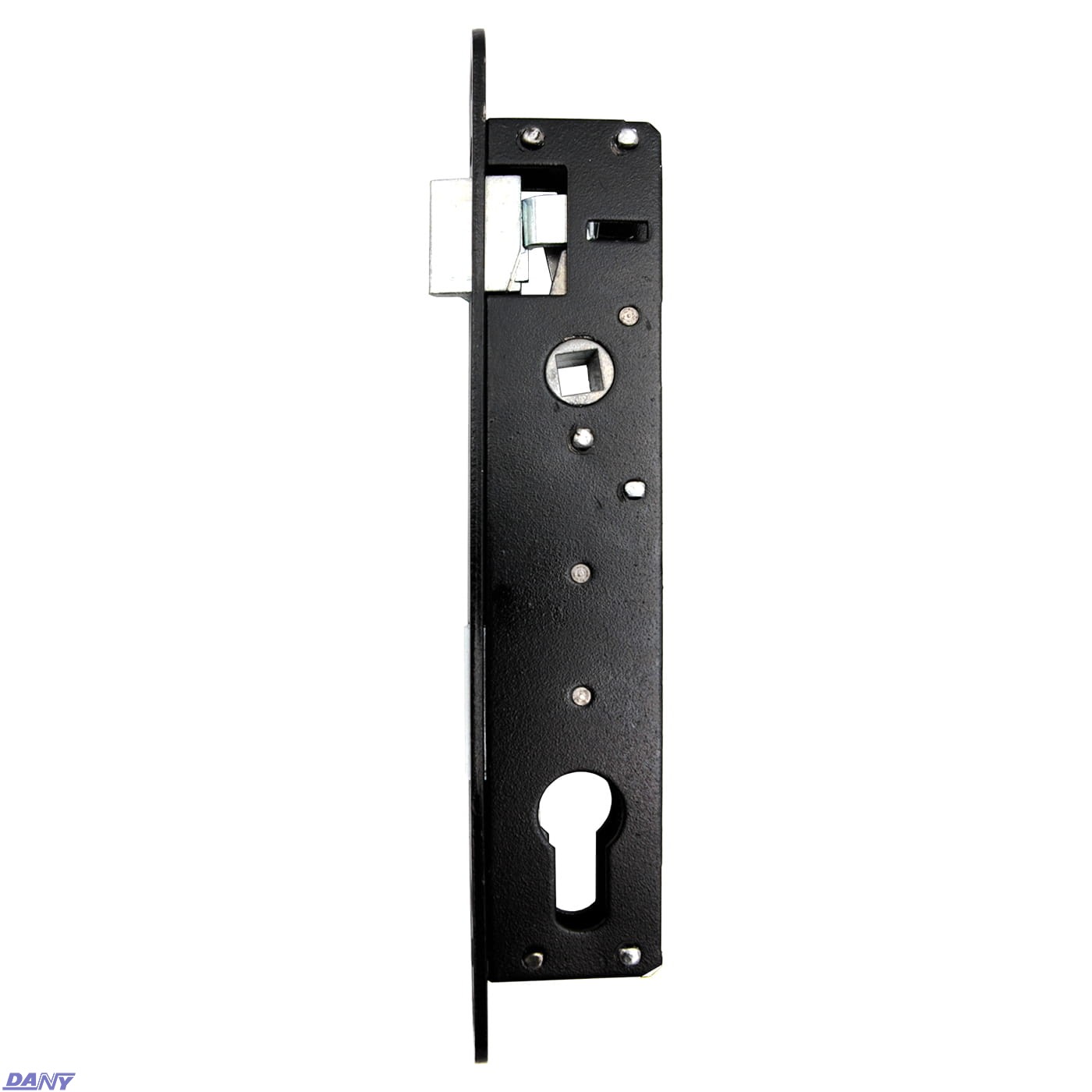 Zamek wpuszczany zapadkowo-zasuwkowy z dźwignią, do drzwi i furtek.